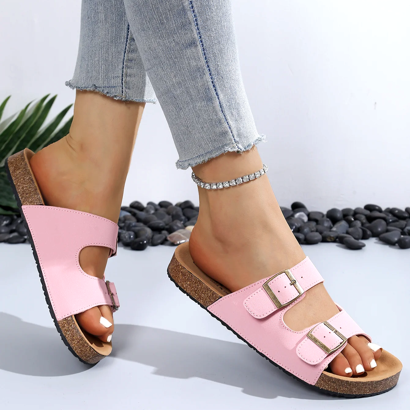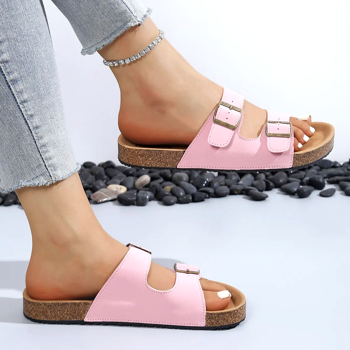 For days, you just want to head out without overthinking it, these slides have your back. Cushy, supportive footbed, soft suede-like straps, and chunky buckles that go with literally anything. Finished with a cork-look sole for that laid-back, natural vibe wherever the day takes you.